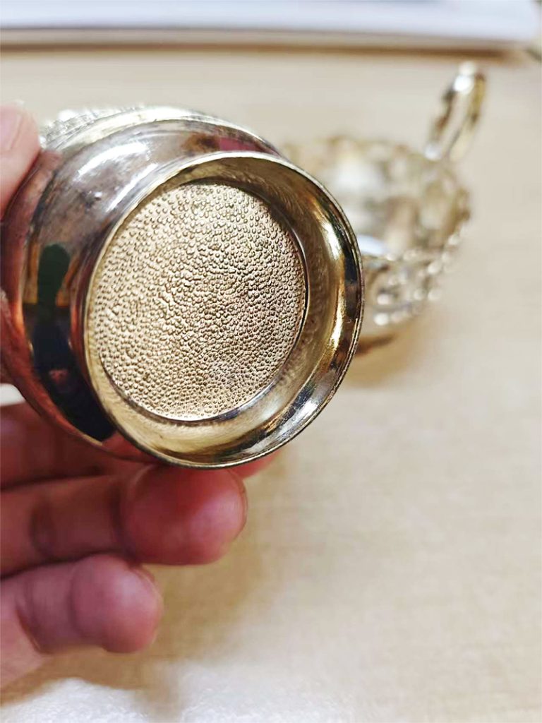 This pure silver hollow – out carved cup is made in Japan, embodying the essence of Japanese craftsmanship. The cup body adopts a delicate hollow – out carving design, with intricate and complex patterns that seem to be vivid, fully demonstrating the ingenuity. The pure silver material endows it with a warm luster and noble texture. Whether used as a utensil for daily tea drinking or for decorative display, it can add an elegant and luxurious touch to life. It is a perfect combination of Japanese craft aesthetics and practical value.
