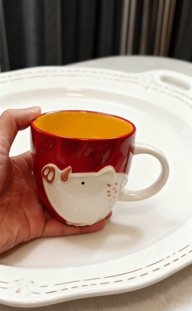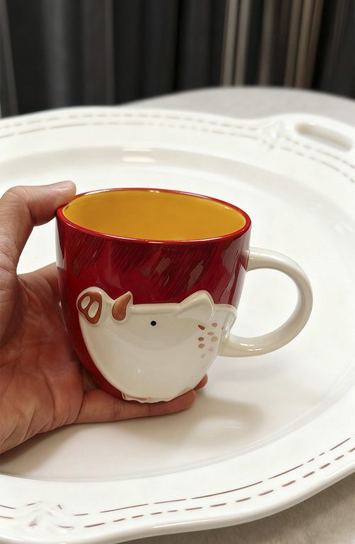 This Starbucks mug interprets cute aesthetics with ingenious design. The main body of the mug features a vibrant red glaze, paired with a bright warm yellow interior, creating distinct and dynamic visual layers. The 3D pig pattern on the front of the mug is a design highlight. The cute pig is crafted from white porcelain glaze, with its snout and spots meticulously carved. The three-dimensional shape brings the cuteness to life, as if injecting a touch of playfulness into daily drinking moments.